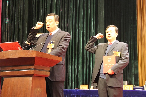 温宿县第十三届人民代表大会选举产生了温宿县监察委员会主任。图为新当选的温宿县监察委员会主任刘洪胜在全体人大代表的见证下,向宪法庄严宣誓