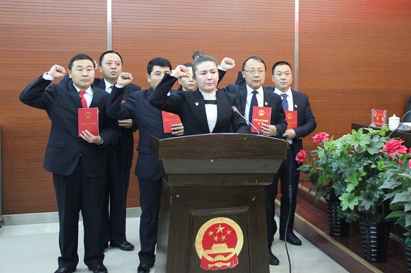 在县委常委、纪委书记、监察委员会主任巴哈尔古丽·艾麦提的带领下,县监察委员会班子成员集体向宪法宣誓:“忠于中华人民共和国宪法,维护宪法权威……”